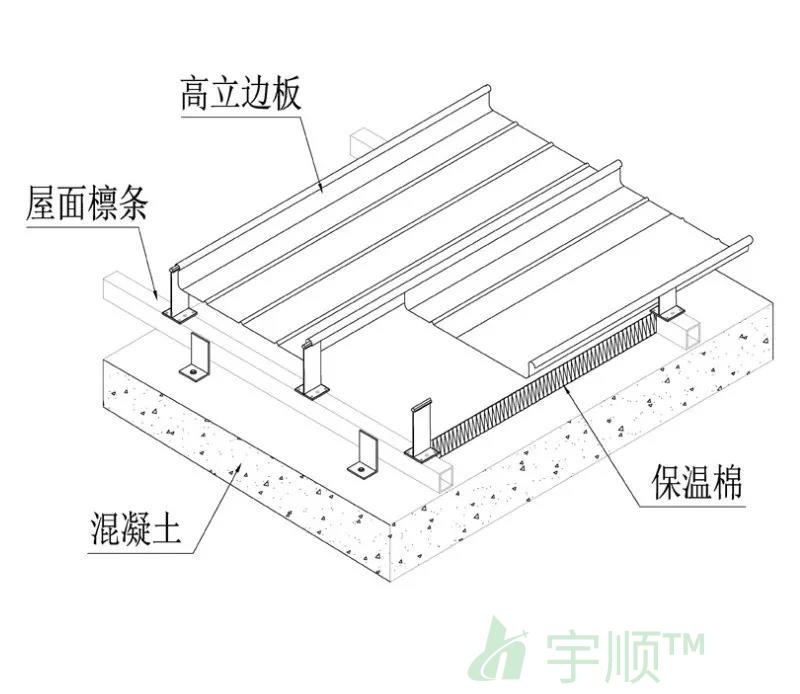 矮立邊鋁鎂錳板是采用立邊咬合構造,咬合的方式與高立邊不同。材料利用方面矮立邊鋁鎂錳系統有著較高的材料利用率最高可以達到82.5%,而高立邊屋面鋁鎂錳系統只有71.6%左右,基層與檁條之間用自攻螺絲固定。另一方面基層與面板之間用不銹鋼或鋁鎂錳板材料做的扣件固定,屋面板塊之間是以特有的咬合折疊方式銜接,上下兩塊板搭載重合后,以270°單咬合或360°雙咬合,所以矮立邊屋面施工難度更大一點,但是構成一個密封的整體,屋面會有很好的防水防滲性能。