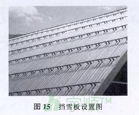 北方地區的屋面一般需要設置擋雪板。擋雪板材質一般為不銹鋼或鋁合金。擋雪板可根據屋面的基本雪壓和坡度來布置。天溝及檐口上方必須設置擋雪板,擋雪板的設置見圖15。